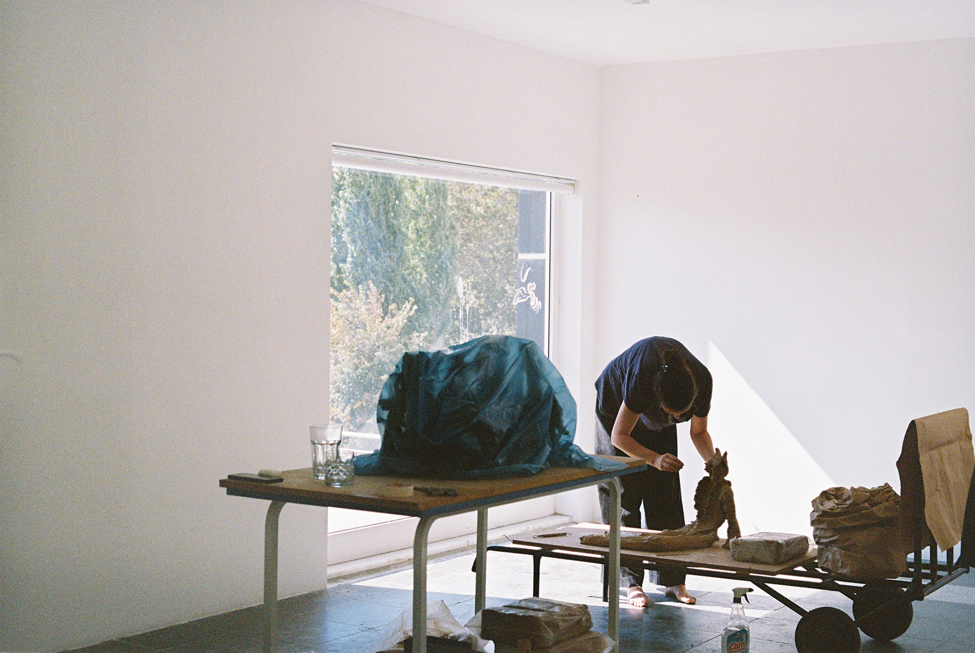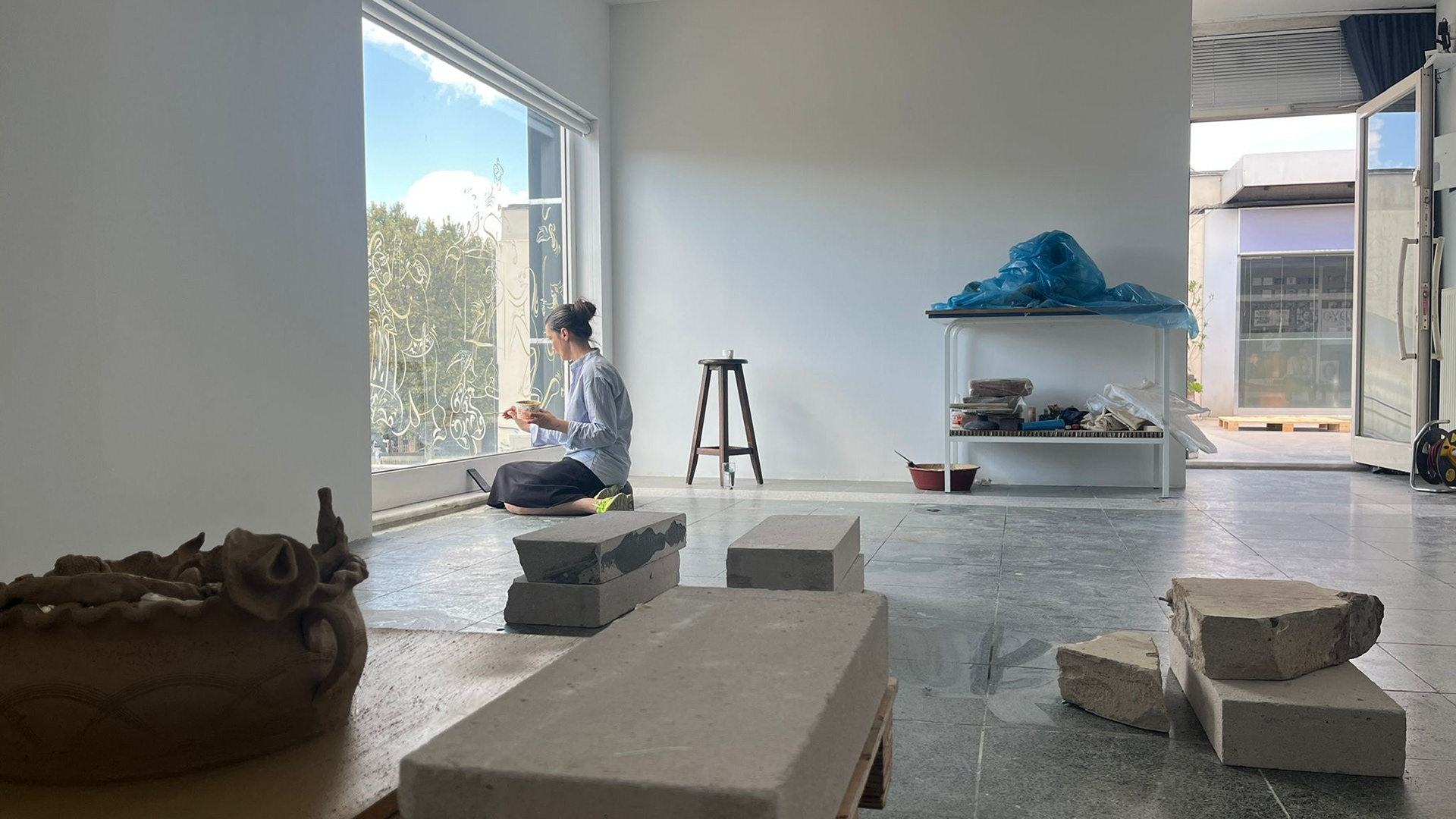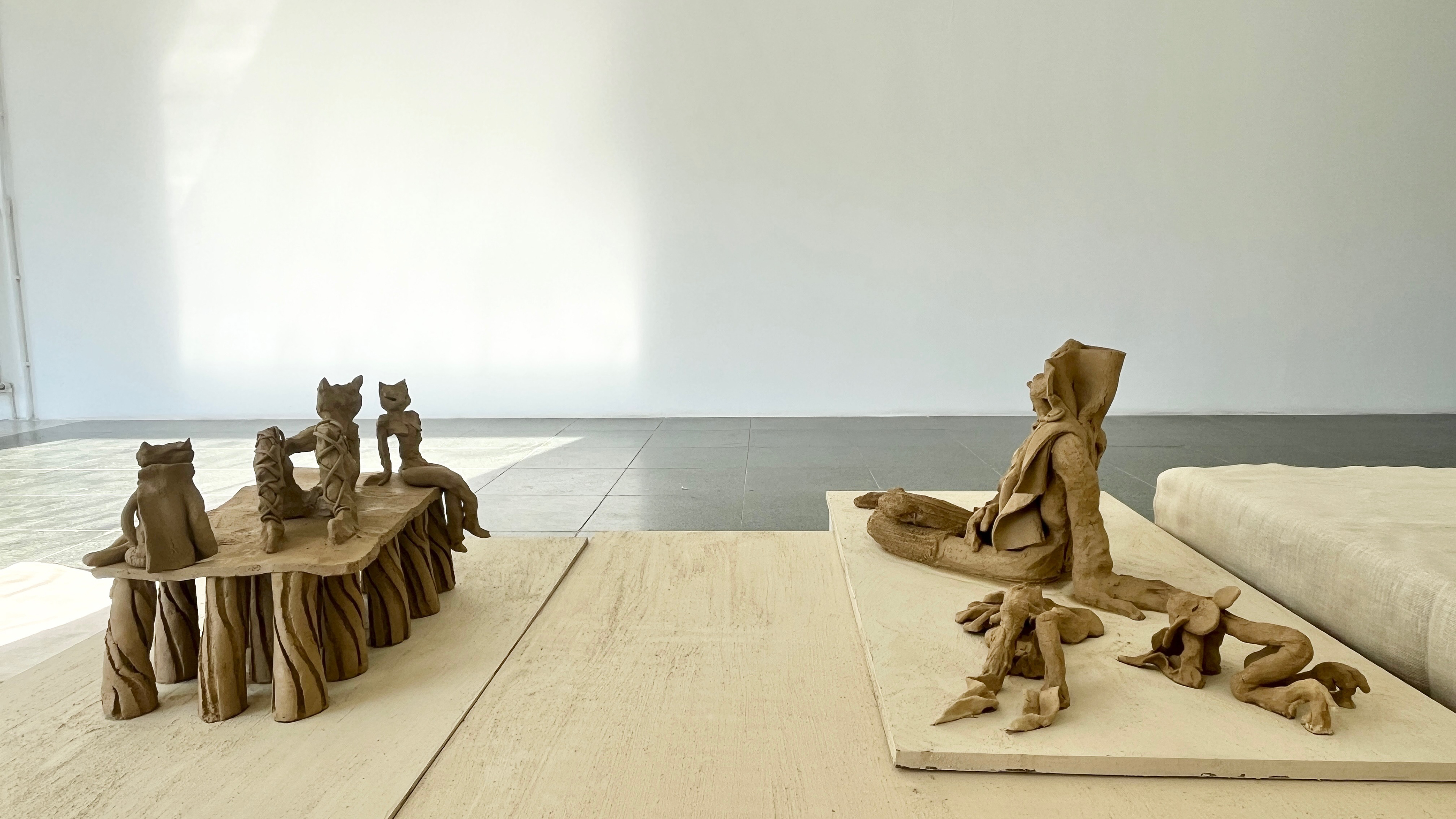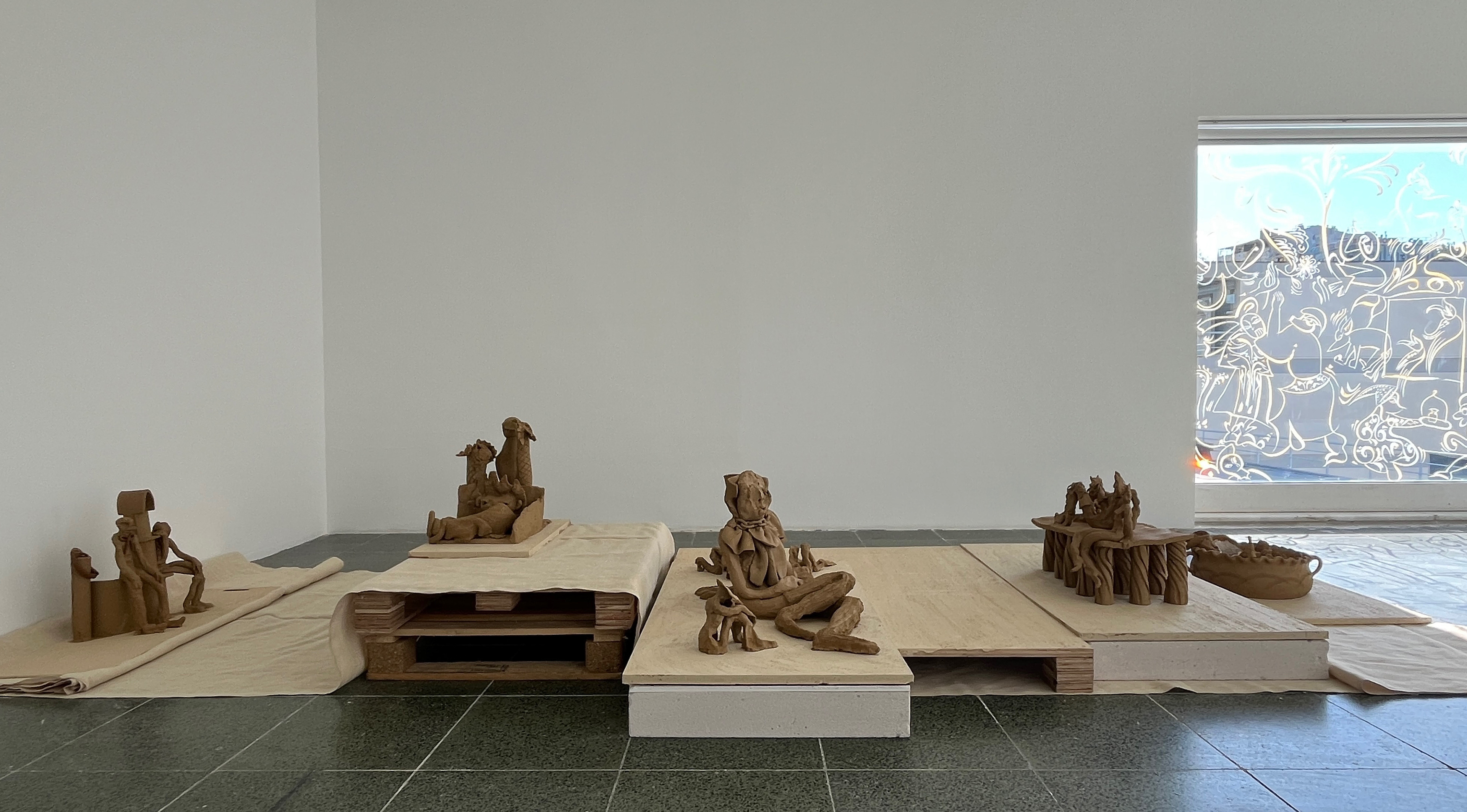With the exception of one work brought from Berlin—a small glazed ceramic piece reflecting the scale of most of her fired works (made to fit her studio kiln)—Ana produced all the other pieces over the course of four days at Non.Sight, in the space generously offered by Merve and Doğancan, using materials sourced or found locally. These include five sculptures or groupings made from unfired clay, along with a window drawing also made with clay. Obliquely, the show reflects on the realities of artistic labor, offering a response to the often complicated and invisible working conditions burdened by the costs and logistics of shipping and presentation.